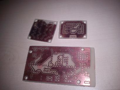 Here's some we made earlier! Etched and drilled PCBs waiting for final cutting and sanding. Note a small trace on the largest board in need of a bit of TLC. This is repaired prior to circuit assembly.
